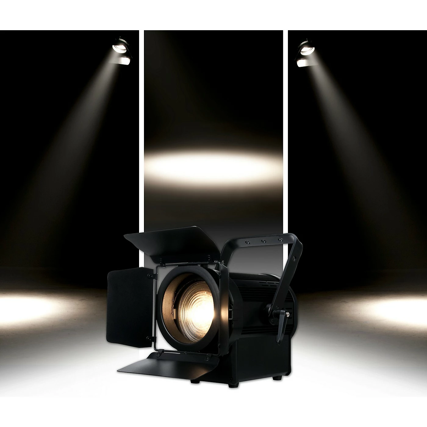 Part of the Encore stage lighting series, the Encore FR150Z lighting fixture is equipped with an 8 in. Fresnel lens and powered by a 130W LED engine. It produces a white wide, soft-edged beam for stage and theatre use at 3000K. It comes with barn doors to adjust the beam dispersion and a manual know to change the beam angle from 8 to 50 degrees. The Encore FR150Z has a 4-button LCD operational menu, 3-pin and 5-pin DMX In/Out and powerCON In/Out to daisy chain the power from one fixture to another.