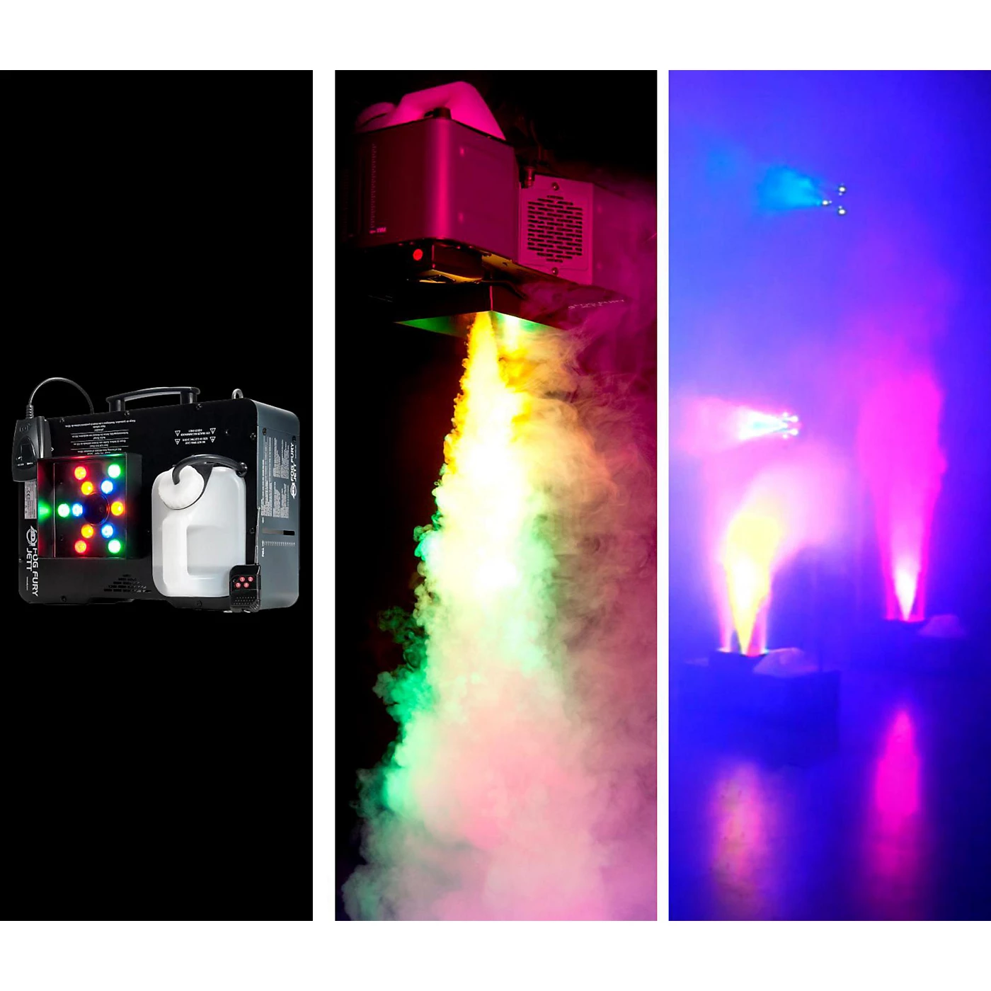 The ADJ Fog Fury Jett is a high velocity vertical Fog Machine that mixes color into the fog from 12x 3-Watt RGBA LEDs. With new advances in ADJs heater technology, the Fog Fury Jett produces a dry even blast of fog over 25 feet (7 meters) in the air. It has a special heating element design that uses an oil type transmission throughout the pipeline to prevent clogging. It is also equipped with a high performance Italian pump system for optimum output. ADJs Electronic Thermo Sensing (ETS) technology is on-board to maintain optimum heat levels with short warm-up time between fog blasts.The Fog Fury Jett may be use vertically or horizontally. The reservoir tank may be mounted in the front or rear of the unit so the machine may be pointed up or down. The ADJ FFJWR wireless remote comes included with the Fog Fury Jett.