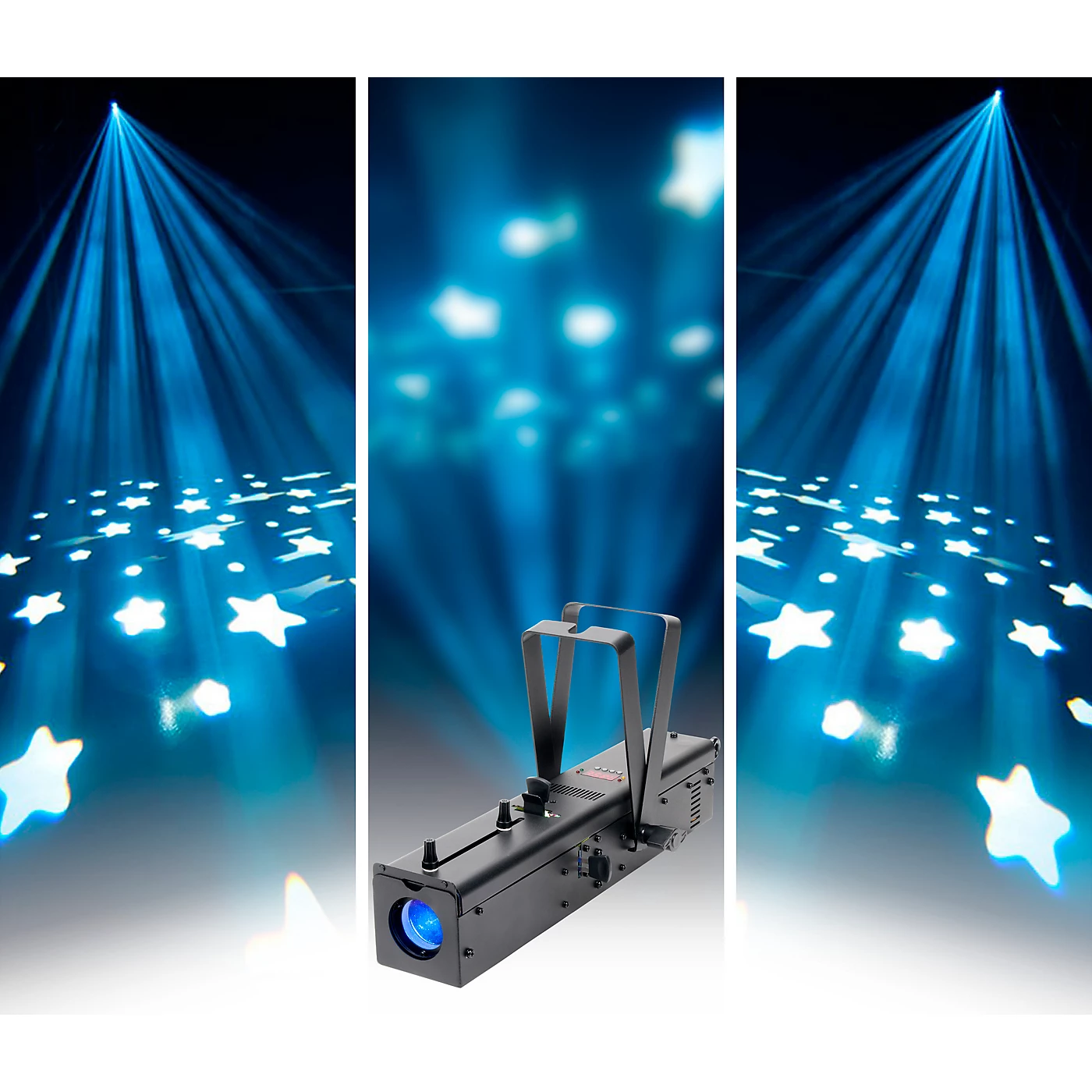 The Ikon Profile is a high output single GOBO Projector powered by a bright 32W (7500K) white LED. This fixture uses high quality optics for crisp, clear projection. User can adjust the LED brightness and strobing via DMX or by the included wireless UC IR remote control.