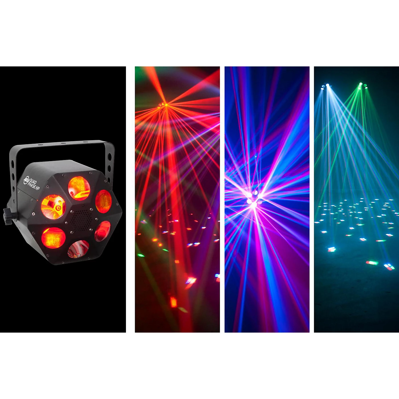 ADJ’s Quad Phase HP is designed to fill a room and dazzle a crowd with dozens of razor sharp beams of light. This technologically advanced moonflower features a high-powered, 32-Watt 4-in-1 quad color LED source (RGBW). Offering twice as many majestic colors as a “TRI LED”, the Quad Phase HP produces up to fifteen colors in all.The Quad Phase HP also offers all the latest features sought after in special effects lights such as: DMX-512 for programming or linking capabilities, exciting built-in sound active programs, no duty cycle (run all night), a long life, high output LED source (30,000 hours), 4-button DMX display on rear (for easier programmability), IEC power daisy-chaining, and a 1.8-degree steeper motor for smooth movement. The Quad Phase HP may be controlled by a DMX Controller or ADJ’s UC3 easy-to-use mini controller.
