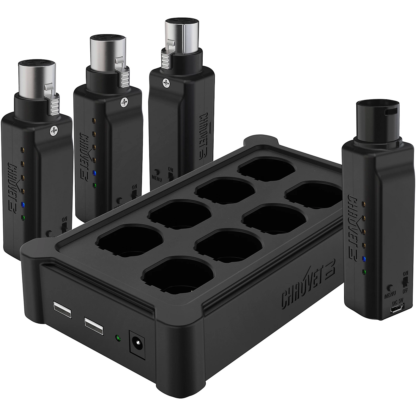 With the CHAUVET DJ D-FI XLR pack, you can make any DMX-compatible light wireless. The wonders of wireless DMX control have arrived to previously non-wireless lights with D-Fi XLR. This cutting-edge technology provides instant wireless communication through compact battery-powered wireless D-Fi receiver or transmitter units that plug directly into the XLR port of DMX-compatible lights. Contact pins charge all D-Fi XLRs without the need for any cables. The D-Fi XLR Pack includes 1 transmitter, 3 receivers and 1 multi-charger. The multi-charger simultaneously charges up to 8 D-Fi XLRs (additional units sold separately). D-Fi XLR Pack even has 2 additional USB ports to charge additional devices.