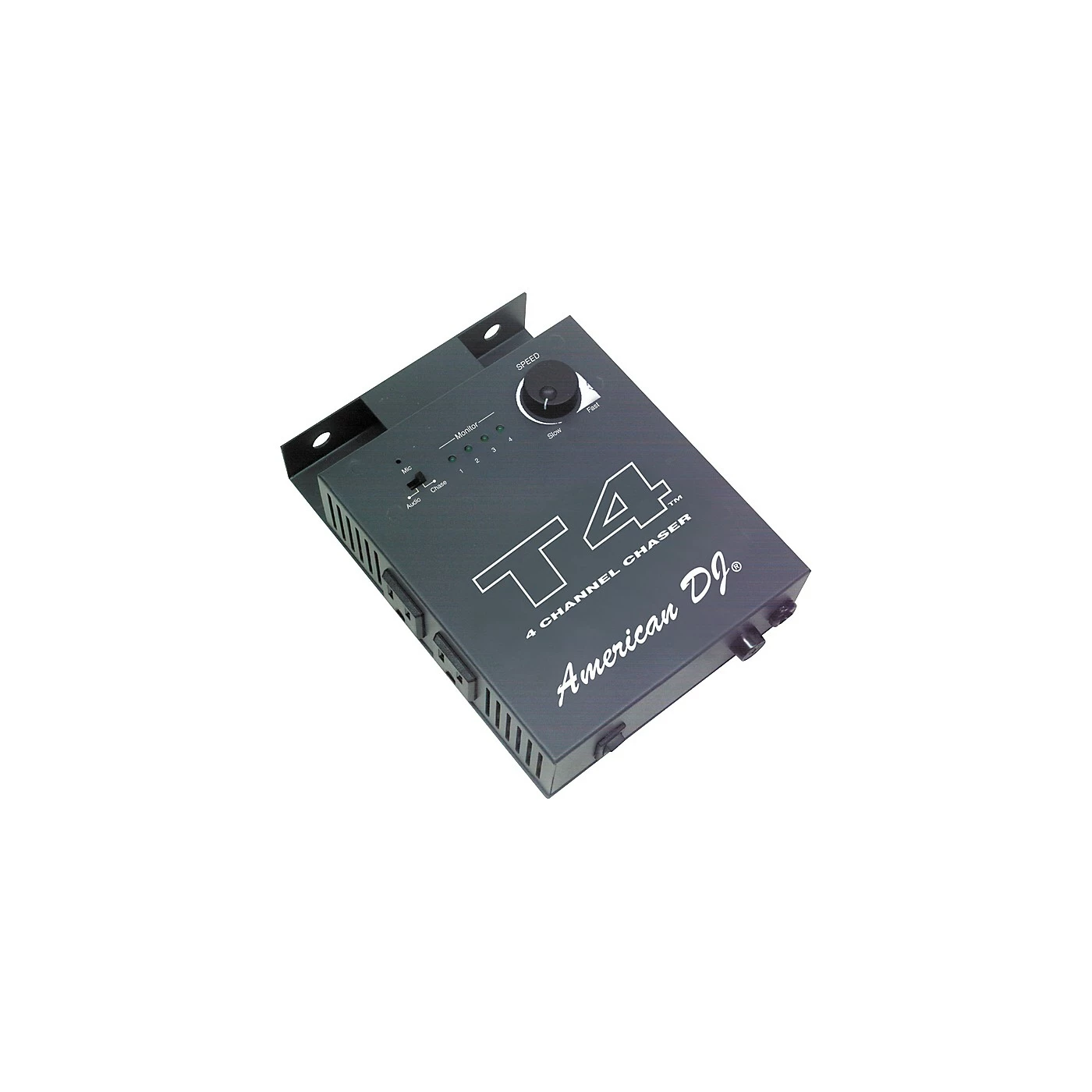 The Elation T4 4-Channel Chase Controller allows you to coordinate your lights and your music for greater impact. 4 standard 3-prong plugs. The chase light controller has timed, audio, or chase modes switch and speed knob. Built-in mic and LED channel indicators. Hanging bracket allows easy mounting on light stands.