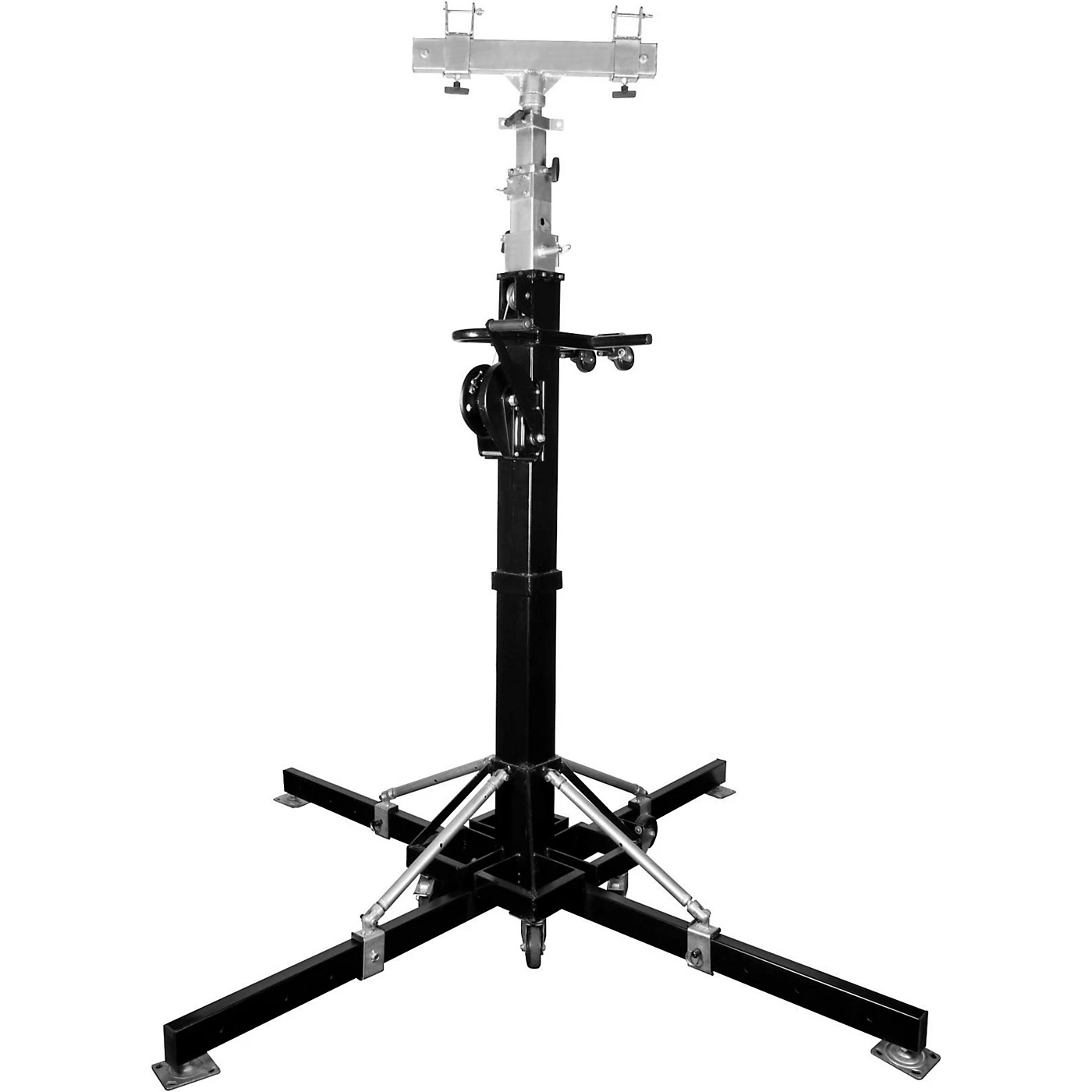 The TRUSST® Crank Tower 6.0 is a crank up tower stand with a maximum height of 6 meters (19.7 ft). It is capable of lifting and supporting up to 250 kg (550 lbs) safely. Constructed almost entirely of metal, there are no plastic parts to break or strip. The Crank Tower 6.0 comes complete with a T-bar adaptor. The T-bar adaptor is adjustable to fit multiple sizes of truss. The rubber coated feet and polyurethane wheels help protect flooring surfaces from scratches. The built in safety locks and integrated winch brake prevent the the load from coming down uncontrollably.